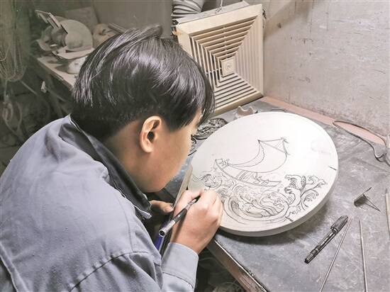 工匠对茶坑石原石进行设计 通讯员供图 |