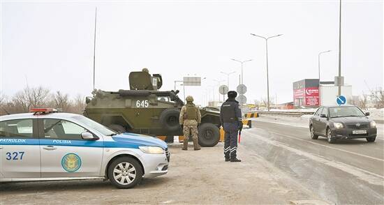 1月7日,哈萨克斯坦首都努尔苏丹,警察守卫交通要道 图/人民视觉 |