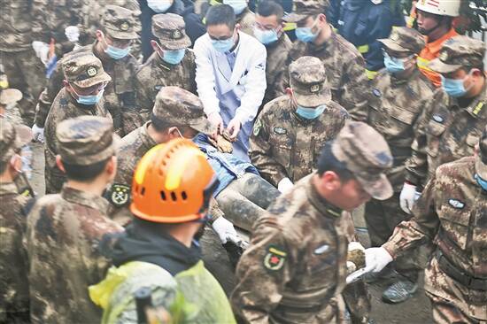 救援人员抬出一名被困者 新华社发 |
