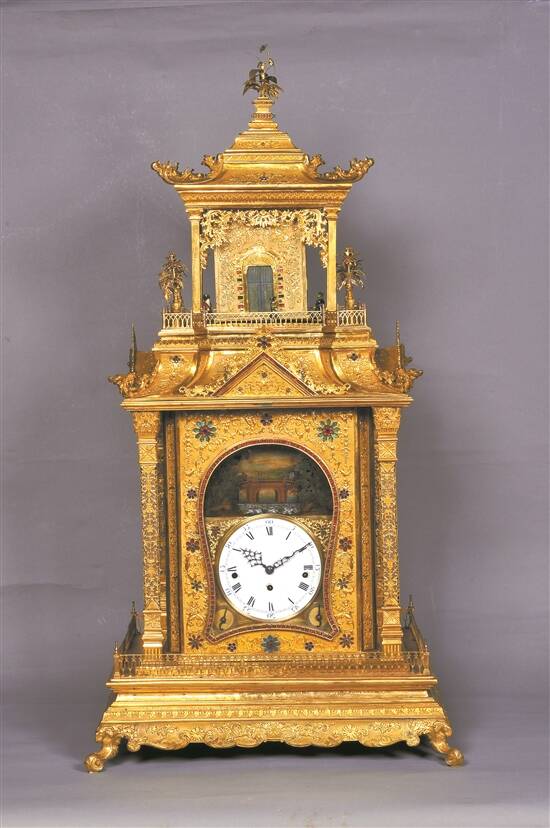 文字整理/羊城晚报记者 黄宙辉 通讯员 李明晖 图/广州博物馆提供 在粤海关向皇帝进贡的物品中,西洋钟是最重要的品类之一。西洋钟最早是在明万历年间(1573-1620年)传入我国。广州居中西贸易之要冲,得风气之先,大量西洋钟在此集散,因此催生了本地造钟业的诞生,号为“广钟”。因西洋钟备受康熙、雍正、乾陵三代帝王喜爱,广州也由此掀起了持续百余年的西洋钟表热,是当时中国生产自鸣钟表的重要基地之一。精美绝伦的广钟也成为了粤海关每年向宫廷进贡的重要珍品。 据乾隆朝贡档的不完全统计,乾隆时期广东进贡的钟表约有1400余件,约占各地进献钟表的一半,其中广钟的数量应当不在少数。目前,故宫专门开辟了一个“钟表馆”,陈列着自康熙开始数代清帝积累起来的清宫旧藏钟表,广钟的收藏量是其中的佼佼者。这件镀金转人转鸭自鸣钟便是1960年由故宫博物院调拨至广州博物馆。 该自鸣钟是乾隆时期广钟的代表佳作,其铜胎镀金,通高约63厘米,整体造型是二层楼阁式。底层内部有机械装置,下层正面的钟盘上有三个弦孔,分别负责走时、报时、报刻。右下角的小盘是星期盘,指针每天走一格,七天转一周。左下角的小盘是乐曲盘,调整指针就可以变换不同的乐曲。上层是非常传统的中国式亭台,亭台正中是大门,四周有一圈外番模样的人物,下方有小桥流水,凫水鸭子的乡村风光。自鸣钟每隔15分钟就报时一次,这时候中间的大门就会打开,走出二个牙雕献宝人,亭台周围的西洋人也会绕亭转动,河中水鸭也随之荡漾转圈,这座自鸣钟之名即由此而来。 广州博物馆深研清代钟表的老专家黄庆昌先生曾说:“(西洋)钟表在中国传播和被接受的速度是其他任何西方物品无法比拟的。一方面,钟表在西方有非常悠久深厚的发展历史,代表着当时西方的物理学、天文学、机械学、动力学等科学技术的发展水平,而另一方面也切中中国皇帝爱慕新颖奇巧之物的心理。在实用性上,传统中国使用漏刻、更香、日晷等进行报时,相对而言更加小巧精致,走时更加准确。因此一时风靡于宫廷贵族之家。”广钟可谓是这阵西方艺术、文化、科技东渐之风的历史见证者和推进者。 不过,广钟的出现并未能在中国大地上掀起科技进步的风潮,工艺上的模仿也未能激起科学精神的孕育勃发,广钟的发展很大程度上还是依赖于皇帝的喜好。随着嘉庆皇帝对西洋器物兴趣的锐减,广钟也逐渐式微,不可避免地湮没在历史的尘埃之中。