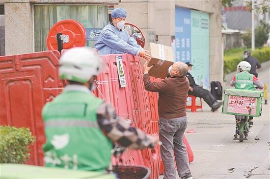 市民隔着护栏,向封控管控区内传递生活物资 |