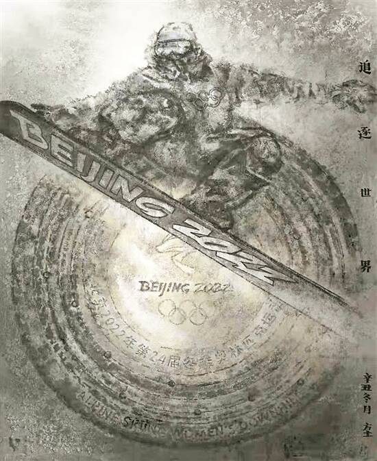 《追逐世界》是参加“天地人和——中国国家画院2022北京冬奥主题美术创作项目”作品,取材女子单板滑雪与本次运动会金奖奖牌构成画面主体,以水墨略施浅绛,更直接而纯粹地传达出速度与激情的运动精神。