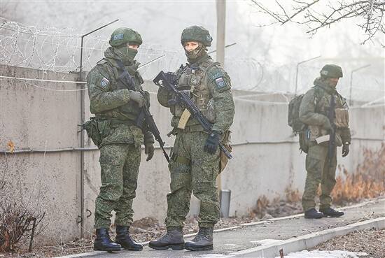 12日,来自俄罗斯等国家的维和人员在阿拉木图警戒 图/人民视觉 |