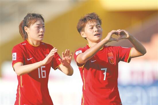 王霜(右)“比心”庆祝进球 图/视觉中国 |