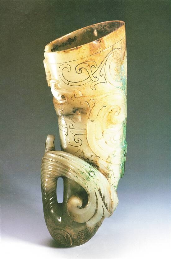 文字整理/羊城晚报记者 黄宙辉 通讯员 黄巧好 图/南越王博物院提供 2002年,国家文物局明确规定禁止出境展出的64件/套的文物名录中,就有广州市南越王墓出土文物的一套一件入选,分别是漆木屏风铜构件和犀角形玉杯。其中,这件犀角形玉杯堪称独一无二的汉代玉器精品。 犀角形玉杯于南越王墓主棺室的头箱中出土,它在造型、纹饰和工艺上都体现了汉代玉容器和中国饮酒器之美。 玉杯使用的是一块上等的青玉玉料,经过掏膛、圆雕、透雕和浮雕等工艺,最终形成了上宽下窄的犀牛角造型,但底部并不似其他玉杯平底,故而无法单独直立于平面上。玉杯杯身呈半透明状,局部有红褐色浸斑,仿犀角形,中空。纹饰自口沿处为一立姿夔龙向后展开,纹样绕着器身回环卷缠,逐渐高起,由浅浮雕过渡到高浮雕,底部则蜿蜒呈圆雕歧尾状。 在南越王墓中,犀牛的形象出现在两处,除了犀角杯以犀角为造型外,还有一件作为墓主人组玉佩构件的犀形璜。《史记·货殖列传》《汉书·地理志下》中均有关于岭南犀牛的记载。秦汉时期,犀曾被列为岭南重要的经济物资,在赵佗向汉廷进贡的礼品清单中也出现了“犀角十”的字眼。结合南越王墓中出土的这两件犀牛造型玉器,可见两千多年前的汉代岭南仍有犀牛的踪迹,而这只犀角形玉杯极有可能是当地工匠借鉴了犀牛角造型后的一种尝试。 在我国目前所见出土的高古玉杯中,只有这件玉杯是以犀牛角为造型的,故极为珍贵。但这样尖底的饮用器具要如何使用和放置呢?通过古代的图像资料我们可知,先秦及汉朝均有手持角杯饮酒的风俗,因此犀角形玉杯极有可能是一种捧于手中、须一饮而尽后才能放下的饮酒器。
