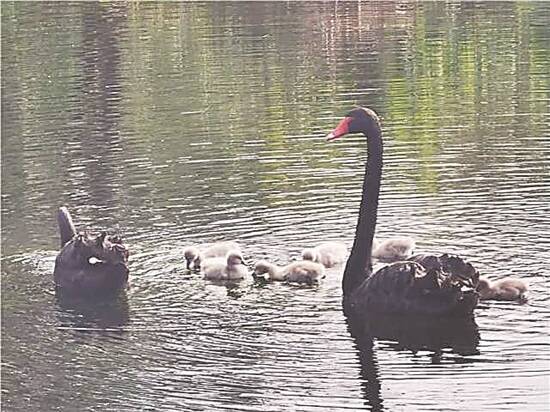 2021年7月,4只来自广州动物园的黑天鹅落户流花湖公园鹭岛景区,它们在优美的生态环境中享受惬意的生活,很快就成为园区一道灵动的风景。 近日,工作人员巡园的时候惊喜地发现它们原来已经升级为宝爸宝妈,其中一对黑天鹅还孵化出七只小宝宝,出现在鹭岛景区的湖面上(上图)。 (文/图 李春炜 陈秋明 任彬)