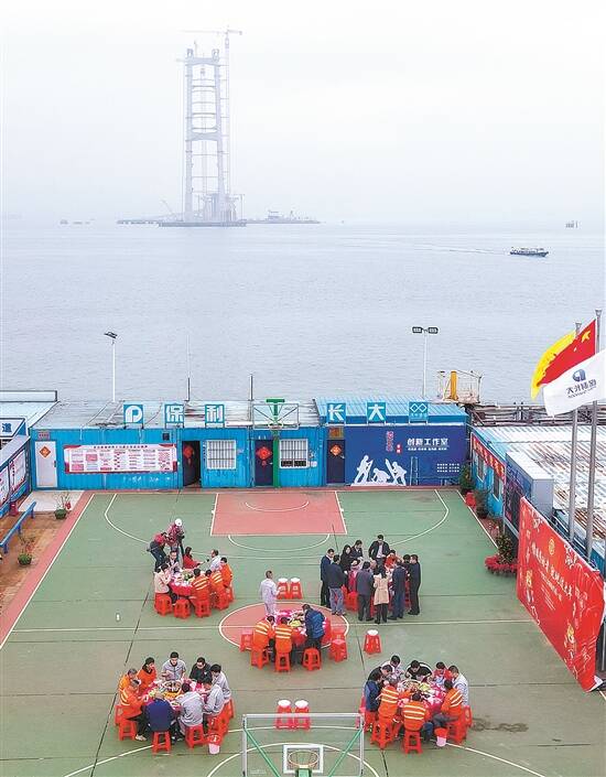 文/图 羊城晚报记者 王丹阳 通讯员 岳路建 韩冬冬 “海上过年,开饭啦!”1月29日(腊月廿七)开始,一盆盆粤式美味大盆菜“漂洋过海”,被送到深中通道伶仃洋大桥西主塔海上施工平台,为春节留岗的逾1500名建设者带来别样年味;另一超级工程黄茅海跨海通道的建设现场,留岗红包、工地年夜饭等福利也将让千余名驻留人员有钱赚、不孤单。记者了解到,大湾区部分超级工程春节“不打烊”,建设者工地过大年亦有获得感。 深中通道:1500多名建设者海上过大年 2022年是深中通道爬坡过坎的关键之年。1月以来,深中通道建设捷报频传,多个施工节点取得新突破。咬定目标、铆足干劲,深中通道关键工序春节“不打烊”。超1500名建设者将在海上过年,全力推进桥梁工程上部结构施工及沉管隧道基槽开挖施工等。 就地过年,服务和保障不能少。工程方用心为留岗建设者准备了多重暖心福利,既有津贴、慰问品等礼包,也有丰盛年夜饭、书画名家写春联送“福”、代寄贺卡、“云上看春晚”等活动,让建设者工地过新年,年味“不打折”。 “建设工期紧,加上疫情防控需要,所以我和工友都选择留下来过年,这里同样热闹喜庆。”来自四川大凉山的22岁小伙吉克小平说,这两天,他正忙着和工友们为施工生活区贴上春联和“福”字呢。 黄茅海跨海通道:千余人留守抢抓“黄金期” 大湾区另一超级工程黄茅海跨海通道建设现场,今年春节有1000多名人员自愿坚守在施工一线。工程方积极开展“迎新春送温暖、稳岗留工”专项行动,向留守的建设者发放“留岗红包”“过年礼包”等,让工人有钱赚、有活干,抢抓春节施工“黄金期”。除夕夜包饺子、大年初一发新年礼物、灵活调整休假时间等暖心安排,也让建设者更有归属感和幸福感。 就地过年不是将就过年,是要在奋斗和建设中迎接新年。黄茅海大桥西塔施工技术员林志杰自2020年6月项目正式动工起就一直待在海上。“很多一线人员,既是家庭纽带、顶梁柱,也是建设的主力军。今年留岗过年很暖心,在这种氛围下,大家更愿意为项目多贡献一点。”林志杰如是说。