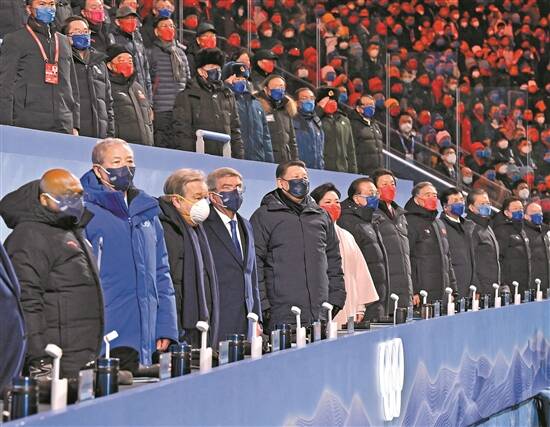 新华社北京2月4日电 筑梦冰雪,同向未来。2022年2月4日晚,举世瞩目的北京第二十四届冬季奥林匹克运动会开幕式在国家体育场隆重举行。国家主席习近平出席开幕式并宣布本届冬奥会开幕。中华文明与奥林匹克运动再度携手,奏响全人类团结、和平、友谊的华美乐章。 李克强、栗战书、汪洋、王沪宁、赵乐际、韩正、王岐山等党和国家领导人,国际奥委会主席巴赫,以及来自世界各地的领导人和贵宾出席开幕式。 夜幕下的国家体育场华灯璀璨、美轮美奂,这座以鸟巢造型闻名于世的建筑,即将创造历史,成为世界上首座举办过冬奥会和夏奥会“双奥”开幕式的体育场馆。 19时15分许,来自世界各地的国家元首、政府首脑、王室成员和国际组织负责人等贵宾陆续抵达。此时的金色大厅流光溢彩,充满着春节喜庆气氛和冬奥激情活力。 开幕式正式开始前,国家体育场气氛热烈。伴随着欢快的音乐,来自北京、河北两地的群众来到场内,以质朴而火热的广场舞表演笑迎八方宾朋。场地上巨大的“福”字,营造出中国年的喜庆氛围。大屏幕上,来自河北张家口、黑龙江哈尔滨、江苏南京等国内10座城市的群众,向世界展现着中国“三亿人参与冰雪运动”的热忱和激情。联合国秘书长古特雷斯也发表了视频致辞。场内、场外,中国、世界,共同唱响“一起向未来”的冰雪欢歌。 19时57分,体育场中央上万平方米冰雪晶莹的巨幅地屏上出现“过年好”的中英文字样。在《和平——命运共同体》的乐曲声中,习近平和夫人彭丽媛同巴赫等走上主席台,向观众挥手致意。全场响起长时间热烈的掌声和欢呼声。 2月4日,恰逢中国农历二十四节气中的第一个节气“立春”。20时整,开幕式倒计时表演在中国传统历法的时光轮转中开篇,大屏幕上依次闪现二十四节气,全场观众随着数字变换齐声呼喊:10、9、8、7、6、5、4、3、2、1……在一片欢呼声中,体育场中央地屏上,一轮明月升起,翩翩彩蝶飞舞,蒲公英的种子飞向空中,绚丽的焰火点亮鸟巢上空,绽放出“立春”的中英文造型,在冬日传递着春的消息。 播音员向观众介绍中国国家主席习近平、国际奥委会主席巴赫,习近平和巴赫起身向大家挥手致意,全场再次响起热烈掌声。 一名儿童小号手吹响《我和我的祖国》的悠扬旋律。中国各行各业、先进模范人物、56个民族的代表,用双手将鲜艳的五星红旗缓缓传递到体育场升旗区,交付礼兵手中。全体起立,高唱中华人民共和国国歌。五星红旗冉冉升起,迎风飘扬。 场内灯光转暗,一滴冰蓝色的水墨沿着巨幅竖屏从天而降,幻化为黄河之水,一泻千里,翻腾的浪涛凝结为一片冰雪天地。一座巨型冰立方从冰雪天地中形成,过往23届冬奥举办城市历史,随着24道“激光刻刀”的雕琢,闪回其上,最终定格为“2022中国北京”。6名冰球运动员“滑”入场内,做出挥杆击球动作,带动“激光刻刀”的激烈雕琢,最终将冰立方塑造成为晶莹剔透的冰雪五环。 20时17分,运动员入场式开始。一扇冰雪雕刻的“中国门”打开,来自奥林匹克运动发源地的希腊代表团首先入场,下届冬奥会举办地的意大利代表团和本届冬奥会东道主中国代表团最后出场,其他国家和地区代表团按简化汉字笔画顺序先后入场。本届冬奥会共有91个国家和地区的代表团参加。在未来的16天时间里,近3000名运动员将在五环旗下同场竞技。伴随着19首世界名曲串接组成的背景音乐,运动员们步入体育场,不时向观众挥手致意。现场观众用热烈的掌声和欢呼声,欢迎他们的到来。 在《歌唱祖国》的激昂旋律声中,东道主中国代表团最后入场,两名持旗手——中国钢架雪车女将赵丹和速度滑冰名将高亭宇走在队伍最前列。场上掌声雷动,欢呼声一浪高过一浪。本届冬奥会中国代表团共388人,其中运动员177人,创历届冬奥会中国参赛人数之最。 运动员入场完毕,各代表团引导员高举雪花造型引导牌聚合在一起,共同构成一朵“大雪花”,大屏幕播放短片《更强更团结》,将开幕式“世界大同,天下一家”的主题表现得淋漓尽致。 随后,北京冬奥组委主席蔡奇致辞。他说,正值中国农历虎年新春之际,来自世界各地的运动员、教练员和嘉宾相聚北京,共享冬奥盛会,见证北京成为全球首个“双奥之城”,见证中国为奥林匹克运动续写新的传奇。在习近平主席亲自推动和中国政府坚强领导下,我们践行绿色、共享、开放、廉洁的办奥理念,与国际奥委会等方面通力合作,克服疫情影响,实现北京冬奥会如期开幕,向全世界展现了人类面对困境战胜挑战的坚韧之姿。让我们携手同行,一起向未来,谱写构建人类命运共同体的崭新篇章。 国际奥委会主席巴赫致辞。他感谢北京冬奥组委、中国政府部门和全体中国人民。巴赫说,中国在冬季运动方面取得的非凡成就,开启了全球冬季运动的新时代,将使全球冬季运动参与度登上新台阶,让中国人民和全球各地的冬季运动爱好者从中受益。 21时51分,开幕式迎来激动人心的一刻。国家主席习近平宣布:北京第二十四届冬季奥林匹克运动会开幕!顿时,全场沸腾,璀璨的焰火腾空而起,在空中呈现“迎客松”的造型,表达对全世界来宾的欢迎,掌声、欢呼声经久不息。 来自世界各地的76名年轻人走进体育场,并肩而行。所过之处,一幅展现世界各国人民休戚与共、共克疫情、为梦想激情拼搏的照片长卷徐徐展开,如同一条影像的长