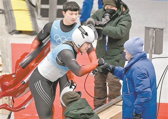 2月9日,国际奥委会主席巴赫(右)给双人雪橇项目中国选手黄叶波(中)、彭俊越加油鼓劲 图/视觉中国 |