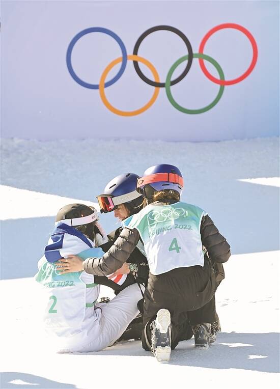 2月8日,谷爱凌(右)和格雷莫(中)在比赛后安慰勒德 新华社发 |