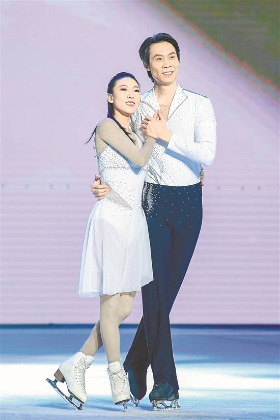庞清(左)和佟健在冰上舞剧中展示世界冠军风采 图/羊城晚报特派记者 梁喻 林桂炎 |