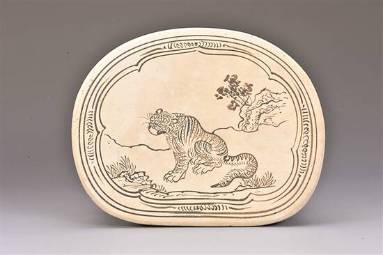 宋 河北磁州窑“张家造”开光坐虎纹腰圆形枕 |