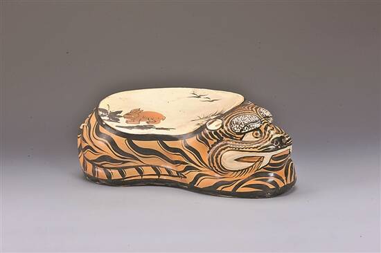宋 河北磁州窑黑褐彩雁兔纹卧虎形枕 |