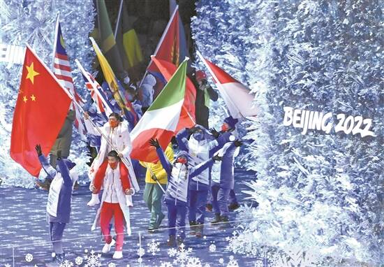 北京第二十四届冬季奥林匹克运动会闭幕式在国家体育场举行,代表团旗帜和运动员入场 新华社发 |