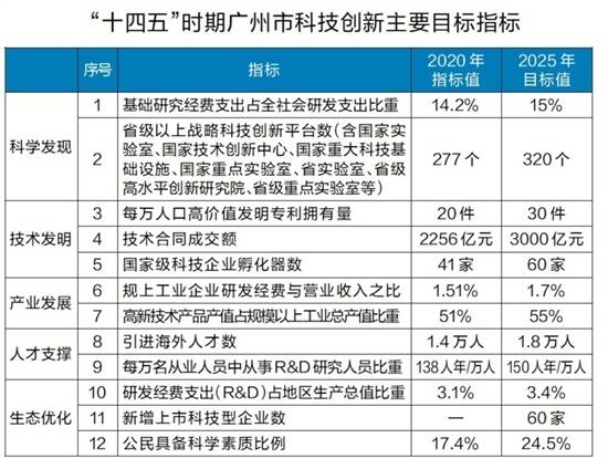 羊城晚报记者 李钢 广州市科技创新“十四五”规划于近日发布!规划提出,至2025年,广州要成为世界重大科学发现和技术发明先行之地、国际科技赋能老城市新活力的典范之都、全球极具吸引力的高水平开放创新之城。 广州科创水平已跻身全国前列 《规划》指出,“十三五”期间,广州市深入实施创新驱动发展战略,科技创新水平跻身全国前列,在全球创新版图中的位势进一步提升。“广州—深圳—香港创新集群”在2020年全球创新集群百强中位居第2位。广州在“自然指数—科研城市”排名跃升至全球第15位,在入选中国城市中,排名从2015年的第9位上升到第5位。 科创整体实力争取达世界主要城市先进水平 《规划》明确,到2025年,广州建设具有全球影响力的科技创新强市取得重大进展,贯穿“科学发现、技术发明、产业发展、人才支撑、生态优化”的全链条创新体系更加健全,重点领域取得全国领先、全球一流的战略性优势,科技创新整体实力达到世界主要城市先进水平,创新之城更加令人向往,成为世界重大科学发现和技术发明先行之地、国际科技赋能老城市新活力的典范之都、全球极具吸引力的高水平开放创新之城。 构建“一轴四核多点”为主的科创空间功能布局 “十四五”期间,广州要构建“一轴四核多点”为主的科技创新空间功能布局,形成“一轴核心驱动、四核战略支撑、多点全域协同”的点线面多层次格局,促进区域联动、高效协同,强化与珠江沿岸高质量发展的衔接,集聚高端创新资源,提升重大创新节点能级,辐射带动广深港、广珠澳科技创新走廊建设。 一轴:即科技创新轴。以中新广州知识城和南沙科学城为极点,链接广州科学城、广州国际生物岛、广州人工智能与数字经济试验区、天河智慧城、广州大学城、白云湖数字科技城、南沙庆盛片区、明珠科学园等全市域科技创新关键节点,打造科技创新轴。 四核:即广州人工智能与数字经济试验区、南沙科学城、中新广州知识城、广州科学城。广州人工智能与数字经济试验区促进“一江两岸三片区”良性互动,建设粤港澳大湾区数字经济高质量发展示范区。南沙科学城建设大湾区综合性国家科学中心主要承载区。中新广州知识城建设具有全球影响力的国家知识中心。广州科学城建设具有国际影响力的中国智造中心和“中小企业能办大事”先行示范区。 多点:即新时代全市科技发展的关键节点。在全市范围内推动重要片区、科技园区、创新型商务区组群式发展。中部以荔湾、越秀、天河、海珠、番禺区的重点片区为主体。东部北部以黄埔、增城、白云、花都、从化区的重点片区为主体。南部以南沙区的重点片区为主体。 此外,广州还将强化在战略前沿与基础研究领域、前沿技术与重点产业领域和城市治理与民生科技领域的部署。
