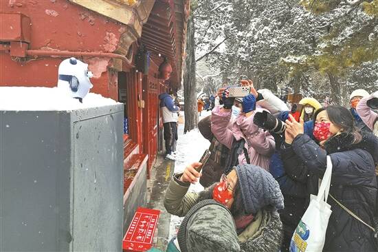 2月13日,一位游客在故宫的一个箱子上放了一个冰墩墩,以此为前景拍摄故宫雪景。形态可掬的冰墩墩立即引起了周围游客的关注,纷纷拿出相机、手机拍起了冰墩墩。