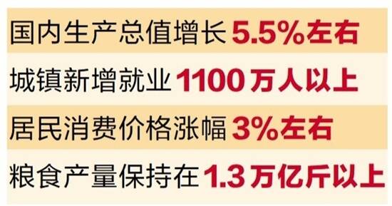 据新华社电 3月5日提请十三届全国人大五次会议审议的政府工作报告提出,今年发展主要预期目标是:国内生产总值增长5.5%左右;城镇新增就业1100万人以上,城镇调查失业率全年控制在5.5%以内;居民消费价格涨幅3%左右;居民收入增长与经济增长基本同步;进出口保稳提质,国际收支基本平衡;粮食产量保持在1.3万亿斤以上;生态环境质量持续改善,主要污染物排放量继续下降;能耗强度目标在“十四五”规划期内统筹考核,并留有适当弹性,新增可再生能源和原料用能不纳入能源消费总量控制。