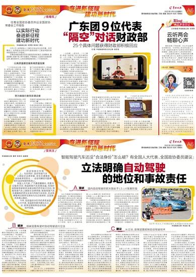 羊城晚报记者 董柳 陈泽云 戚耀琪 自动驾驶正在路上。与此同时,自动驾驶汽车上路缺乏法律依据、发生交通事故该由谁承担责任……这些待解的问题横亘在自动驾驶的前路上。 全国人大代表