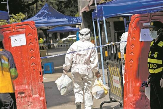 12日,穗花小区居民楼下,管控区工作人员正在协助安排居民的生活物资消毒和发放 羊城晚报记者 宋金峪 摄 |