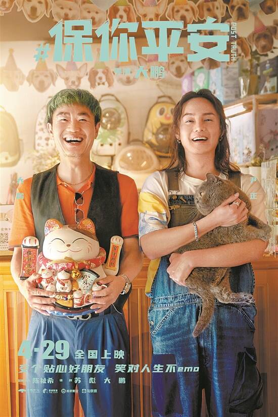 文/李丽 鉴定对象:《保你平安》 上映时间:4月29日 喜剧电影《保你平安》近日宣布定档4月29日。影片发布“笑对人生”版定档海报,欢乐进驻五一档。该片由大鹏执导,苏彪、大鹏编剧,大鹏、李雪琴、尹正、王迅、王圣迪领衔主演,马丽特邀友情出演,宋茜特邀出演,贾冰、杨迪、潘斌龙、倪虹洁主演,乔杉、于洋、刘金山、曹炳琨、梁超友情客串。 电影《保你平安》讲述魏平安中年落魄,工作本就不顺利的他还意外卷入了一场辟谣风波,但为了他人的托付,魏平安毅然踏上令人啼笑皆非的辟谣之路。 造谣一张嘴,辟谣跑断腿。魏平安要在有限的时间里,线上线下找线索寻真相。但在错综复杂的网络世界中,不但别人的谣言还未破除,连魏平安自己也被人传起了谣言,一切就像越滚越大的雪球…… 在“笑对人生”版定档海报中,大鹏扮演的魏平安拿着煎饼,李雪琴扮演的魏如意拿着热气腾腾大包子,简直就是一对吃货兄妹;魏平安捧着招财猫,尹正扮演的托尼则抱着小猫咪,到底谁是真猫奴? 此外,王迅、王圣迪 、马丽、贾冰、乔杉等喜剧面孔的加盟,也让人更加期待影片的“笑果”。