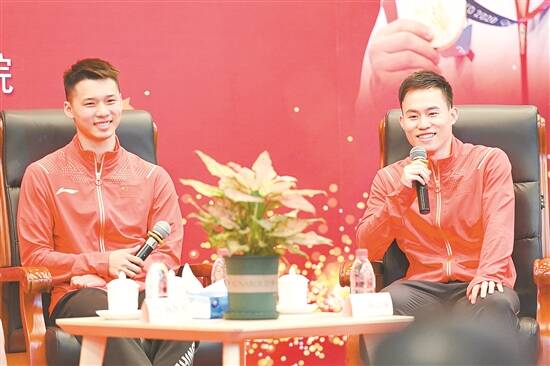陈艾森(左)和谢思埸在暨大和师生分享夺冠经历 图/视觉中国 |