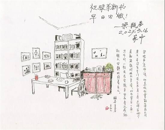 □文/图 绿茶 【走进书房】 广泛看文学之外的书 梁晓声先生高产,从早期的知青题材《今夜有暴风雪》《雪城》《年轮》,到社会分析著作《中国社会各阶层分析》,2019年三卷本《人世间》获茅盾文学奖,2021年,新作《我和我的命》也引起广泛关注。 梁晓声先生家,每个屋子都有书架,他喜欢随时随地能拿起书来读,尤其晚上,必须读书才能睡着,读书就像生物钟一样。书架上的书,哲学、历史、法律、经济学,方方面面的都有。他说自己看书很杂,除了文学书,什么书都看,读书应该是跨界的,文学的书在阅读启蒙阶段及之后的大学阶段,可看的基本都看完了,所以,现在应该广泛看文学之外的书,既是对写作的补充,也是对形成自己丰富看法和认识的基础。 梁先生说他很少关注读者对自己的新书的反响,了结一本书,就进入下一本书的创作。现在做的事情,都是收尾的工作,把心里还有愿望写的,写出来。等这些小愿望都写完后,该退场就退场。找个地方住着,不再涉及任何文学的事情。 如今,他和小狗皮皮生活在郊区一栋民宅,读书、写作、遛狗,家人都住在城里,儿子儿媳要上班,孙子要上学。 临走前,在梁先生客厅一角速写一张。梁先生问,“你画的这些书房将来要出书吗?”我说,“是的,正在制作中。”梁先生留言:“祝绿茶新书早日出版。” 【读书话题】 把写作当作一门“营生” 绿茶:您的阅读启蒙源自何时?对您有着什么样的影响? 梁晓声:我们这一代人成长的过程,跟一切文艺都很远。当时,如果哪位同学家有收音机,我们会傻乎乎地在人家窗前或门外趴着听。所幸,那个年代还有小人书铺,看一本小人书一分或两分钱。小学期间,把周边的七八个小人书铺所有的书都看完了。这可以算是我的阅读启蒙了。 那个年代,大多数文学名著都改编成小人书了。还有电影版小人书,直接从电影上拓下来的。我记得当时看过一本《前面是急转弯》,讲的是,莫斯科一个青年科学家,他是所有人眼中的科学骄子,大家都很崇拜他,都以他为荣,他也是最早有了车,每个周末从实验室回他的家,和自己的爱人约会。有一天回家的路上,下着雨,他发现地上躺着个人,显然是被车撞了,他下车看到那个人,伸出带血的手向他求救时,他犹豫了,他退回车里,绕了一个弯走了。当时没有手机拍照,也没有摄像头,没有第三者。 这件事在他心里留下很大的不安,但是很快就过去了,生活照旧。但是调查在进行,那个人没有死,他讲到有一辆车,曾经停下来过,有关方面了解后找到他了。这让大家非常惊讶,这么完美的一个人,居然见死不救。人设全面崩塌。这本书对少年的我,影响特别深。 我对这种涉及伦理的故事,印象特别深刻,至今都清晰记得。少年时候的阅读,对人的影响是根深蒂固的,是重要的底色。对我们那代人而言,幸运的是那个年代印成小人书的书,没有不好的。因此,可以无选择的开卷有益。 绿茶:知青年代,还有阅读生活吗? 梁晓声:知识青年多少都会偷偷带到兵团一些,他们带来的书我基本上全读了,有一本书叫《黑面包干》,写卫国战争时期饥饿年代,革命者怎么省下黑面包干给孤儿院的孩子们,给我留下很深的印象。 绿茶:虽然经历那些年代,阅读生活没有间断真是幸运。 梁晓声:但真正的阅读,应该是在复旦大学读书的时候。我们中文系有两个专业,一个评论专业,一个创作专业。我们有两个阅览室。其他系的同学想看,都是通过我们借出来给他们。那个时候是我读书最多的,废寝忘食,每天都待在图书馆里,看一切能看到的书。但即使在复旦大学中文系,当时也没有张爱玲、林语堂、沈从文和胡适等。我是在80年代,接受了一次国外记者访问之后,很尴尬,才找来林语堂的书来读。 绿茶:大学的阅读经历,是让你走上文学之路的契机吧? 梁晓声:大学毕业分到北京电影制片厂之后,看了一系列电影,这个对我的影响很大。对于整个人类和文学和电影的关系,以及什么是好作品,什么是深刻,才有最初的认识。这时候,我的短篇已经获过奖,身份上已经被认定是作家了。 那时候,我们每个星期去电影资料馆,从电影的源头看电影,从一分钟、两分钟,半个小时到三个小时的,黑白电影这么一路看过来。电影伴随着的西方现代主义的步伐,不同时期的电影都有表现。电影中对于深刻的表现往往比小说更直接,更深入人心。 绿茶:小说,或者其他文艺作品的深刻性不能和电影相比吗? 梁晓声:当然不是,不同文艺作品都在深刻性上有自己的表现。比如戏剧《等待戈多》,说实话当时看不懂。如今,我再回想这个剧,有一天晚上我突然明白了。人类文明发展了这么几千年,很多东西都变了,但有些关键的因素始终没变,就像流浪汉脱下鞋子,抖了抖沙子。 再比如,法国雕塑家罗丹,他大多数雕塑都很著名,但有一件雕塑很少有人关注,一个小小的希腊神话中的“人马”。这个雕塑中,人的上半身向上努力地挣扎,扭动着腰部,伸张着手臂,脸上呈现痛苦的表情。原来也不明白怎么回事。现在联系读过或看过的一系列深刻作品后理解了。 再联想诺贝尔奖作品《蝇王》。飞机失事。荒岛上的人分成两派,开始有领地,有领袖,势不两立。显然也是人马主题。电影《出租车司机》,也是讲人马状态。还有《第二十二条军规》《1984》等等。 看完这些我们再来谈深刻,没有超出我们对深刻的理解。而我们现在很多作品还停留在对人性所谓深刻