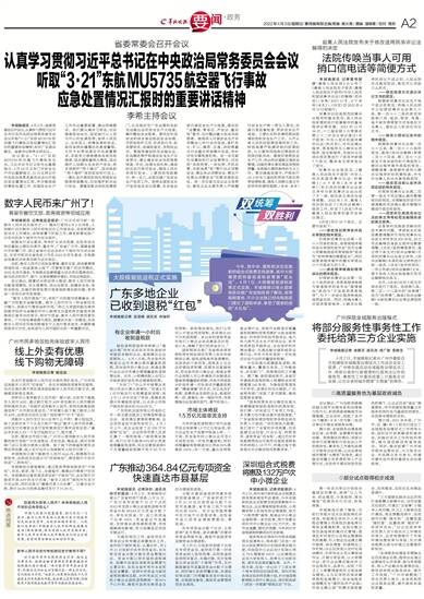 羊城晚报讯 4月2日,省委常委会召开会议,认真学习贯彻习近平总书记在中央政治局常务委员会会议听取“3·21”东航MU5735航空器飞行事故应急处置情况汇报时的重要讲话精神,研究广东落实意见。省委