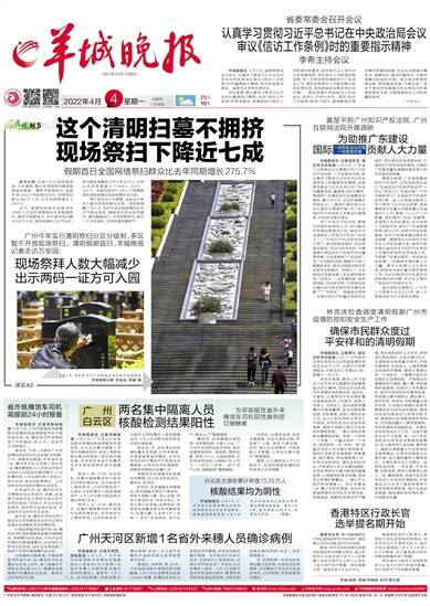1957年10月1日创刊 2022年4月4日 星期一 壬寅年 三月初四 25℃ 10℃ 报料热线:(020)114转羊城晚报报料、(020)87776887 Q友报