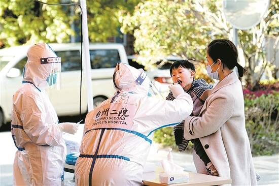4月4日,在上海松江区祥欣居民区,浙江援沪医疗队队员为小朋友进行核酸检测采样 新华社发 |