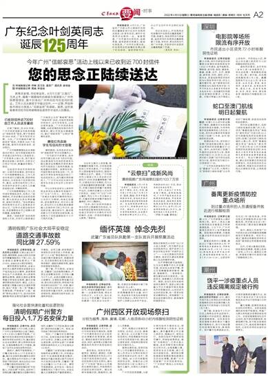 羊城晚报讯 4月5日为“正清日”。记者从广东省民政厅了解到,当天,河源、潮州等2个市以及广州市2个区(荔湾、增城)有序开展现场祭扫活动,其他地区按当地疫情防控要求暂停现场祭扫。全省现场祭扫群众约1