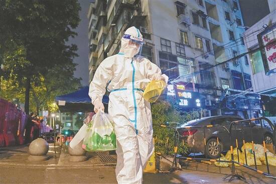 8日晚,棠景街道办事处的工作人员为封控区居民送物资 羊城晚报记者 梁喻 摄 |