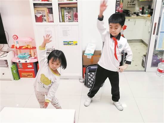 广州农林下路小学一名学生在家领着妹妹做课间操 读者王静怡 供图