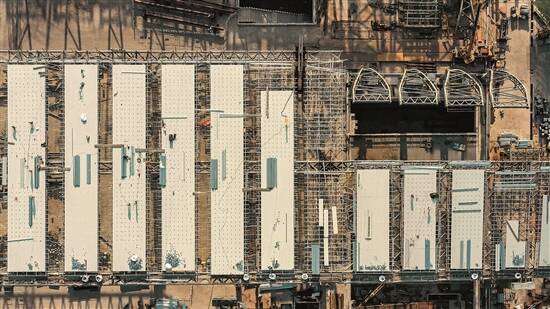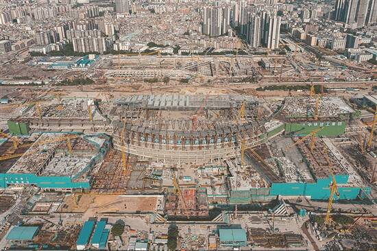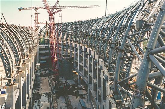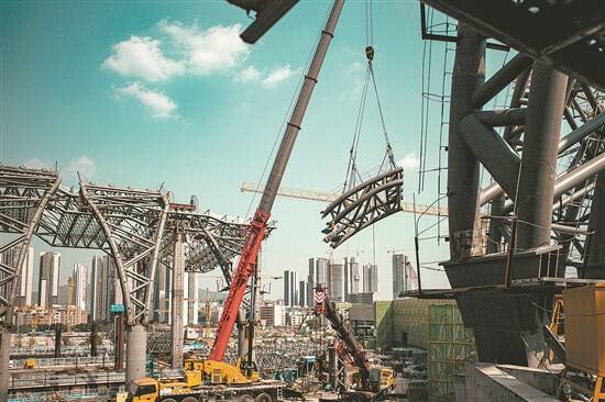 3月18日,在16根立柱连接30台液压提升装置的作用下,总重约2000吨的钢结构桁架缓缓提升,为白云站站房一期工程戴上了一顶“钢帽子”。如今,“钢帽子”已在铺装“帽顶” |