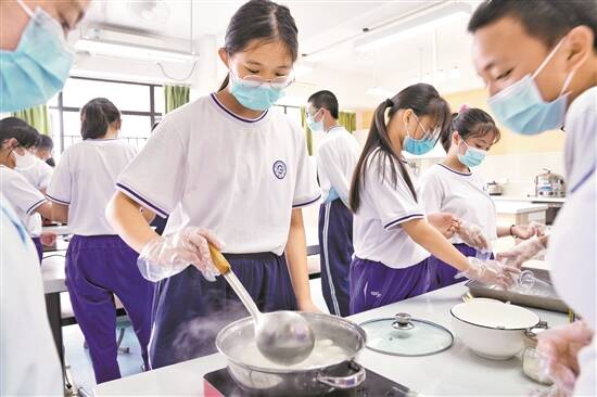 羊城晚报记者 蒋隽 王沫依 何宁 实习生 胡诗怡 近日,教育部发布《义务教育劳动课程标准(2022年版)》(以下简称“标准”),会做西红柿炒鸡蛋将成为中小学生“标配”技能。其实,广州劳动教育走在全国前列,是全国首批率先推出劳动教育细则的城市。校园劳动教育经过2年多的探索丰富,各区各校特色鲜明,劳动内容和成果有趣、有料、有意义。 广州劳动教育 走在全国前列 早在2019年,广州就出台了《广州市教育局关于加强中小学(幼儿园)劳动教育的指导意见》(以下简称“意见”)和《广州市中小学劳动教育指导纲要》(以下简称“纲要”),对不同年龄段的中小学生的劳动技能、劳动教育目标等进行了明确。成为全国首批率先推出劳动教育细则的城市。 意见和纲要明确规定:小学生会做一日三餐、安排全家旅行计划;初中生会煲汤、做双皮奶;高中生会理财、通马桶……在全国引发关注和热议。 经过两年多的实践,广州中小学形成了浓厚的劳动教育氛围,德智体美劳五育并举。2021年广州市入选首批全国中小学劳动教育实验区,同时,推进中小学劳动教育列入全市民生实事项目。 2021年,广州市教育局整合劳动教育资源,累计评选出劳动教育试点学校164所、劳动教育特色学校67所,劳动教育基地学校15所,市、区两级中小学生劳动教育基地57所。在教育部门的组织下,共有18000余名普通高中学生开展学农劳动实践活动,约1600名学生开展随机预约劳动实践自由行活动,96所学校的2400余名学生参与结对共建劳动教育活动。 各校因地制宜 课程特色鲜明 广州中小学生的劳动内容和成果可谓是因地制宜“八仙过海,各显神通”,让人目不暇接、眼花缭乱。 凭借地理优势,广州市增城区高级中学开辟了600多平方米的种植园,从中草药的种植到提取,再到制作,学生全程参与,利用碎片化时间,制成一排排整齐的活络油、清凉油、洗发水等制品。在劳动的过程中,学生们获得了技能,也收获了快乐。 广州越秀区朝天小学则充分发挥离广东省中医院距离近、很多学生就是医生子弟的优势,邀请省中医院的医生阿姨们到学校教孩子用中药做美白、祛斑、祛痘面膜。 猪脚醋、鸡脚醋、鲫鱼醋……花都区花东镇联安初级中学学生展现厨艺。同学们或是专注炒米,为臭屁醋的制作做准备;或是介绍工艺流程,为感兴趣的观众盛出一碗碗好吃的美食。 花都区狮岭镇冠华小学的女同学们还会做皮包。该校所在的狮岭镇是“皮具之都”,学校早在2007年就开设了皮具制作课程。校友麦老师到意大利和北京学习皮雕,回乡创业的同时到母校教师弟师妹。一二年级的学生主要学习皮革的剪切、拼接,中高年级同学学习皮雕技艺,还能以皮雕作为小学六年级的皮业作品。 从化区鳌头镇第三中心小学的同学会编竹发簪、花瓶和蜻蜓。老师说:“因为学校主打竹文化主题,所以竹编课程是我们的特色课程。” 广州市教育局局长陈爽表示,广州劳动教育改革创新走在前列,一校一品形成品牌,实践活动内容丰富,各区各校特色鲜明,完成了民生实事各项工作任务,达到了预期的社会效果和育人目标。 案例 沙面小学: 做饭是“标配”技能 根据义务教育课程方案,劳动课程平均每周不少于1课时。在广州,劳动教育安排在综合实践课的课时。 冰箱、烤箱、蒸锅、电饭煲、消毒柜,洗菜池……5月6日,广州市荔湾区沙面小学御景校区(简称“沙面小学”)的生活体验馆俨然成为一个开放性厨房,各种厨具应有尽有。六年级(1)班学生在生活实践课上做创意汤圆。 6—7人一个小组,学生们分成了蜂蜜、牛奶和椰果三个小组,分别调制不同味道的汤圆。大家根据老师写在黑板上的煮汤圆步骤,开始劳动。 “现在提倡健康生活,不要放太多糖哦。”学生们一边在调味,邓卓颖老师一边在提醒。曾心颖和钟好两位同学都分到了牛奶组,他们用牛奶调制出美味的汤圆。 沙面小学劳动学科科组长邓卓颖介绍,学校两年前就在综合实践课开设了劳动技能课程。以往四年级才开始有劳动课,从这学期开始,一年级学生也要开始上劳动课了。“劳动技能课程里老师会列一个学生要掌握的劳动清单,其中做饭做菜是很重要的一项。低年级学生主要学摆水果,创意水果拼盘等,高年级学生开始学做菜。” 邓老师发现,自从上了劳动技能课后,学生们的动手能力和生活自理能力都提升了不少。平时在家里,爸爸妈妈工作很忙,孩子们可以自己做饭做菜,不会饿肚子了。 曾心颖说,她在家尝试过做茶叶蛋,“没想到第一次就成功了,特别开心。”她从小就跟着爸爸妈妈做家务,但是在学校上了劳动课以后,才真正对劳动产生了兴趣,“我们之前做过雪媚娘、西米露、多肉葡萄等,跟同学一起合作,比自己一个人在家里有趣多了。周末在家,还会几个同学一起约好做某一种美食,然后拍视频分享在班级群,老师把我们的视频发在学校官微上,特别有成就感”。 海珠区宝玉直实验小学: 学生变身“农耕达人” 播种、浇灌、采摘、烹饪、品尝,是广州市海珠区宝玉直实验小学的劳动教育一条龙,6日,羊城晚报记者在校园看到,学生在“向阳璞园”天空农场动手实践,从劳动中学习知识、培养品质、收获快乐。 “向阳璞园”天空农场劳动教育实践基地是海珠区第一个在天台建造的具有物联网远程智能控制的校园小农场,实施自动化喷灌系统,连接到每一个种植箱。“可以