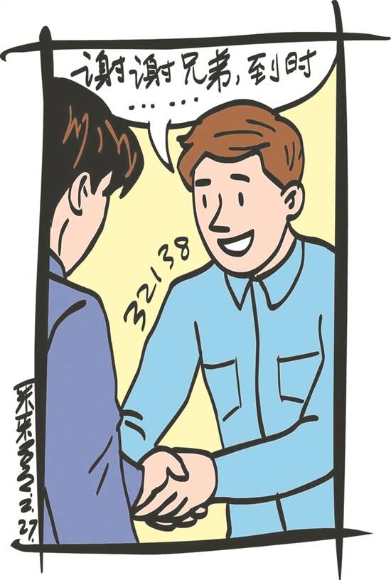 插图 采采 陆哥经常拉刘二来吃饭,刘二总是两手空空,陆嫂心里多多少少有点意见。吃着吃着,他们聊到陆哥儿子的话题。刘二才知道,这回陆哥儿子是带未来媳妇回来,来商讨婚事的。说到这,陆嫂不禁叹了口气,说:“之前已经跟女孩家人在网上聊过,其他东西好办,就是还差几万元的礼金。”陆哥忙打住陆嫂的话头,不想她再继续说下去,只顾着拉刘二喝酒。 两天后,刘二再次来到陆哥的五金店外,见到嫂子在忙活。他刚想打招呼,嫂子以为他又来蹭饭,有点不高兴,说陆哥送货去了。没想,话音刚落,陆哥骑着车回来了。刘二忙从口袋里掏出一个信封,递给陆哥夫妻俩,说:“这是五万元,先借给侄子娶老婆吧。吃了你们那么多顿饭,我总得帮帮忙。” 陆嫂吓了一跳,问:“你哪里来的钱啊?”“放心,是干净钱,我买的彩票中了奖。我不急着用钱,也不用算利息,等你们宽裕了再还我也行。”刘二解释道。 陆哥夫妇既开心又感激。陆哥握住刘二的手,说道:“谢谢兄弟,到时你一定要来喝喜酒。”“一定一定,到时一定去吃八个菜!” “哈哈,不止八个菜。”陆嫂脸上露出灿烂的笑容。 (黄超鹏)