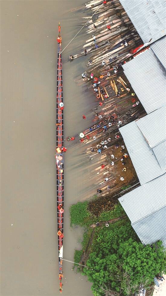 14日上午10时,天河区车陂村新“东坡号”龙舟在番禺区上漖村龙舟制造基地缓缓入水 |