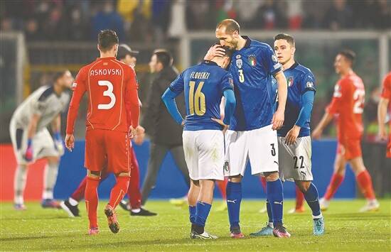 意大利不敌北马其顿无缘卡塔尔世界杯,赛后队员互相安慰 图/视觉中国 |