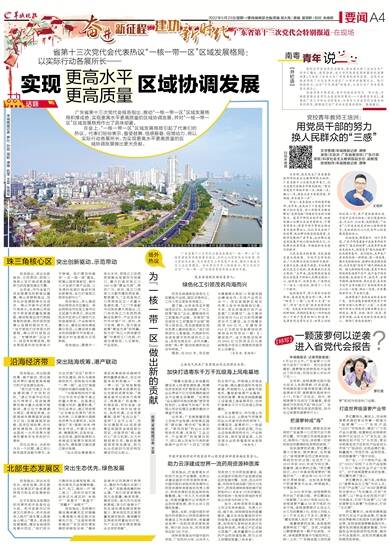 羊城晚报记者 罗仕 孙磊 周聪 谭铮 杭莹 王雷 张璐瑶 广东省第十三次党代会报告指出,推动“一核一带一区”区域发展格局积厚成势,实现更高水平更高质量的区域协调发展,并对“