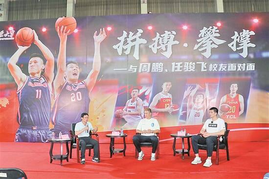 羊城晚报讯 记者龙希摄影报道:“欢迎周鹏、任骏飞师兄回家!”6月10日下午,广东东莞大益队队长周鹏和队员任骏飞现身广东工业大学体育馆。现场气氛热烈,同学们激动欢呼,簇拥上前签名拍照,广工学子们又一次“追星”成功了。 作为广工2011届校友的周鹏和2013届校友的任骏飞,这一次回到母校,不仅对同学们进行了篮球技术上的指导,更以“拼搏·攀撑”为主题与师弟师妹们进行了面对面的交流,传递了他们眼中的体育拼搏精神。 在广工体育馆篮球场,周鹏、任骏飞与学校甲组男篮队员进行了2分钟计时3分球定点投篮游戏,两位大师兄轻松取胜,输了的师弟们现场做起了俯卧撑。他们接下来还就篮球技术等方面与队员们进行了交流互动,并现场指导学校第六届学生篮球联赛四强代表队训练。球场内外,惊叹声、欢呼声、笑声此起彼伏。 在交流会上,两位球员大方分享了自己与篮球之间的趣事。被同学问到在国家队时最激动难忘的时刻,周鹏告诉大家:“在赛场上能为国争光,身披绣着中国国旗的战袍并拿到金牌时,便是自己的高光时刻!” 周鹏还和大家分享了自己在广东队拿到第十一冠后的心路历程:“当时在杜锋教练的指导下,球队创新了打法、战术。利用四年时间拿到了三个冠军,夺得第十一冠、实现三连冠后,才觉得完成了我们这一批队员在宏远队历史舞台上的使命,那一刻才觉得自己没有辜负队友和球迷,发自内心的开心和幸福。” 任骏飞也在分享会上鼓励同学们,要在低谷和困难的时期,坚持自我,永不放弃。他也感谢了母校广东工业大学对自己的栽培和关爱,给了自己一个广阔的平台来实现自己的人生价值。