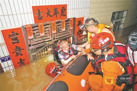 羊城晚报记者 王隽杰 6月21日,暴雨不断,北江支流滃江水面持续上涨。8时,经水文部门监测,英德市英城镇北江英德(五)站水位34.14米,超警戒水位(26.00)8.14米。10时,英德市三防指挥部将防汛Ⅱ级应急响应提升为防汛Ⅰ级应急响应。汛情严峻,消防、武警、政府工作人员第一时间奔赴现场,开展救灾抢险工作。 “江中孤岛”亟待救援 上午10时30分左右,记者来到英德市大站镇广场路,路旁地势较低的停车场被大水淹没,汽车大半泡在水里。沿着广场路旁的一条小径走,不一会儿就到了东岸咀村。从外围望去,东岸咀村已然是一片汪洋,几根电线杆歪歪斜斜裸露在水面上,水中漂浮着椅子、脸盆等各种杂物。 “没见过这么大的雨。”英德市东岸咀码头的一位工人正驾驶着铲车,将浸泡在水中的电箱等危险物品运到地势较高处,他告诉记者,暴雨后,东岸咀村出现水浸情况,且水位一直在上升,目测过去的三个小时里水位涨了差不多40厘米。 暴雨中的公路上,一辆消防车的警示灯不停闪烁。来自英德消防大队英城站的消防队员们,准备经东岸咀村前往受灾更严重的大站镇江南村执行救援任务。 江南村与东岸咀村隔江而望。横亘在两村中间的是北江支流滃江,暴雨持续不断,早已超过警戒水位的北江水位还在继续上涨,受灾严重的江南村已被洪水浸没,成了“江中孤岛”。消防队员们需要跨江而过,抵达江南村转移受灾群众。 江南村村委工作人员黄北方介绍,江南村有17个村小组,常住人口六七百人左右。19日下午,江水开始倒灌,江南村遭遇水浸,目前水浸水位已逼近三层楼高,300多名困在村内的居民亟待救援。 将近中午11时,大站镇政府的几名工作人员抵达救援现场。有工作人员表示,他们的主要任务是配合救援队伍,将困在灾区的群众撤离出来,同时将保障物资送到前线。 没过多久,消防救援队的充气艇驶入洪水深处,开始了第一轮搜救行动。 多方协作转移群众 快速分发救生衣,加速给橡皮艇充气,迅速推冲锋艇下水……雨势愈来愈急,救援前的准备工作尤其高效。 “大家有没有信心?” “有!” 伴随着一声响亮而坚决的回答,首批武警官兵开始下水救援。据清远支队副支队长黄金刚介绍,此次共有30名武警官兵执行转移江南村被困群众任务。 “因为水位持续上涨,很多房屋、电线已完全被淹没,船艇行驶中极容易受阻。同时,部分民房位置偏僻,只能架梯子过去,这给救援增加了难度。”英德消防救援大队英城站副站长许轩说。 难归难,救援行动不停歇,救援队伍优先转移被困老人和小孩。由于船艇抵达的地方也有水浸,水深基本到脚踝附近,救援人员便背着、抱着行动不便的老人将其安全送下船。 “暂时安排他们在东岸咀村附近的小学休息。”镇政府工作人员说。 紧张救援仍在进行 一转眼,已经是下午3时许,数十名被困居民被安全转移。记者和救援队伍沟通后,被允许跟随一辆冲锋艇深入江南村救援现场。 坐在船艇上,记者看到,滃江与滃江两岸的村庄连成一片,只能通过江面上的几艘货轮大致辨别江与岸的分界。 船艇行驶十分钟左右,救援队伍到达了救援行动的“临时中转站”。一名镇政府工作人员说,这里原先是江南码头,如今供救援船只暂时停靠、接送群众。 绕过“中转站”,再前行不远就是江南村。记者到达时,江南村的水位已超过两层楼高,许多房屋只能看到房顶一角露。由于遭受暴雨袭击,很多树枝折断、树干倾斜,高低电线横拦在水面上,救援队伍经过时需要低头弯腰才能避开。 下午3时30分左右,船艇抵达江南村村委会所在的楼房,水位已近三楼,救援人员将冲锋艇停在窗口处,接出被困人员。 在另一个救援现场,由于水位过高,有孕妇被困在屋顶上。救援人员便沿着房屋墙壁,将梯子搭在船艇上,帮助其脱困。 下午4时40分,许轩告诉记者,他所在的救援小组已成功转移50余名群众。截至记者发稿,仍然有群众受困,救援行动仍在紧张进行中。