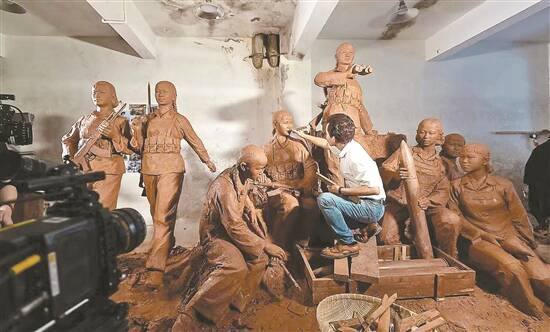 文/羊城晚报记者 文艺 朱绍杰 图/羊城晚报记者 邓勃 通讯员 陈永福 许鸿飞简介: 许鸿飞,广东阳江人,1990年毕业于广州美术学院。现为全国政协委员、中国美术家协会理事、广东省美术家协会副主席、广州雕塑院院长。《九天九夜》《吻》《飞花》《童趣》《三个女人》等多件代表作被各个国家及地区的政府、博物馆、机构收藏。 【走进工作室】 ◎黄永玉与石磨坊 雕塑家许鸿飞的工作名号“石磨坊”,与一个石磨样式的茶桌有关。取这个名字的是许鸿飞的忘年交——著名画家黄永玉先生。 “2001年,黄永玉先生来到我这个尚未命名的工作室,看到这个茶桌,就替我取了‘石磨坊’这个室名。”许鸿飞说。茶桌周围,方方正正地摆放着四条齐高的长形木凳,客人们就围坐在这里喝茶聊天。 他继续介绍:“石磨茶桌是我1995年做的,除了喝茶,它真的还可以当石磨,只是从来没有使用过。因为我主要是用来喝茶,所以把磨盘的边缘做得比普通的磨盘更宽一些,刚好可以放下一个茶杯。”茶桌正上方,是黄永玉先生亲笔题写的“石磨坊”三字。 在石磨坊,几乎每天都有客人前来拜访。在羊城晚报记者采访的这一段时间,前前后后就来了四批客人。许鸿飞说,起初的“石磨坊”并不在现在的位置,而位于旁边一处平房建筑,因为租期原因,2017年他将“石磨坊”工作室搬到了这里,石磨茶桌也一起搬了过来。 许鸿飞对这个茶桌有着独特的感情,有几次外出展览时,他甚至还把石磨打包,一起运到展场。“2013年在中国美术馆办展览时,我就把它带了过去,在北京也可以喝茶聊天!后来到国家大剧院办展览,主办方主动提出让我把石磨带过去,他们想在展览现场还原我工作室的场景。”他说。 现在的石磨坊,比以前的工作室空间更加宽敞,负一楼的地下室是他雕塑创作空间,上面三层则是作品的陈列空间。许鸿飞每天上午来到这里,一般到晚上11时过才收拾回家。除了外出办展,他几乎所有时间都消磨在工作室里,就连节假日也不例外。 ◎带“肥女”成为六国“荣誉市民” “肥女”系列雕塑作品是许鸿飞的代表作。在石磨坊,随处可见她们的身影:有作品《技惊四座》里用单手撑起整个身体,顶技动作酷炫无比的肥女;有《天使之吻》中双脚腾空,以跪姿状与伴侣亲吻的肥女;还有骑自行车的、赶鹅的、喂猪的肥女…… 如今,“肥女”已经成为许鸿飞的个人符号,与他如影随形。除了让“肥女”出现在她的诞生地广州的各种场景中,许鸿飞还将目光看向了更远的海外。近年来,如何助力中国文化“走出去”是他一直在思考和践行的事。 2013年起,许鸿飞开始办雕塑世界巡展。到目前,他带着“肥女”已经到访过十八个国家和地区,共办了43场展览。许鸿飞因此还获得了6个国家的荣誉市民称号,这在国内艺术家中并不多见。 许鸿飞带着肥女一起去过世界著名艺术殿堂——卢浮宫,走过古老而明艳动人的哈瓦那街道,也到过西班牙的历史名城萨拉曼卡……在世界各地的巡展中,不同肤色和种族的人们纷纷来到肥女雕塑前,模仿她的动作,合影留念,感受来自遥远中国的艺术与欢乐。 许鸿飞告诉记者,他尽量做到每场展览的作品不重复,只有《天使之吻》这一件作品会出现在每场展览中。“因为爱是具有世界共通性的。世界上许多雕塑家都以爱和吻的主题进行创作,但大多都是站着或躺着,像《天使之吻》这样跳起来接吻的构图是比较少见的,而且它也带有‘肥女’的符号。”许鸿飞说。 ◎艺术助力乡村振兴 许鸿飞做事总是雷厉风行,想到什么就会立马去做。不仅是做雕塑,办展览也是如此。有时他一个月要跑3个国家,今天还在俄罗斯,明天就赶到了日本。 受新冠疫情的影响,许鸿飞近几年大部分世界巡展都延期了,他于是将视野转向乡村。作为一名雕塑艺术家,同时也是全国政协委员,他始终关注乡村,致力于用艺术助力乡村振兴。在去年的全国两会上,许鸿飞委员的提案就是《艺术助推乡村振兴,破解城乡二元结构》。 为了将这一倡议付诸实施,他从2020年5月开始,在全国范围内启动雕塑百村展,带那些曾到过世界知名博物馆、美术馆的作品走向田间地头。至今,许鸿飞已造访了广州的塱头古村、清远的连樟村、海南博鳌的南强村等18个村落。 “村民很少有机会接触这样的艺术品,艺术家把这样接地气并且具有感染力的作品放在他们家门口,会产生一种艺术的触动。”许鸿飞认为,“肥女”系列作品之所以能够融入乡村,是因为它本身非常接地气,而且很多展示的都是乡村生活场景。 此外,许鸿飞还聚焦抗击疫情、冬奥盛会、航空航天等紧扣时代脉搏的主题创作。在石磨坊中,可以看到一些诸如“肥女”们在排队打疫苗、滑雪的作品,同样在幽默中被许鸿飞赋予了时代的元素。 【艺谈】 创意 羊城晚报:其实很久之前就在许多公共场所看到你的作品了,那些雕塑和你今天倡导的艺术有什么区别? 许鸿飞:我努力做一些原创的艺术作品,让人一看便知道是谁做的。以往他人来定制,对方让你做马、你就做马,让你做鱼、你就做鱼,限定是非常明确,个人施展空间有限。这只能算是一个雕塑类工程,而不叫艺术作品。这样的工程以前我做了很多,东莞有十多个镇的主雕都是我做的;我也为许多房地产楼盘做过。 但我一直在探索自己的创作方向。直到1998年,我无意中做了一个肥女雕塑。第二年,黄永玉老