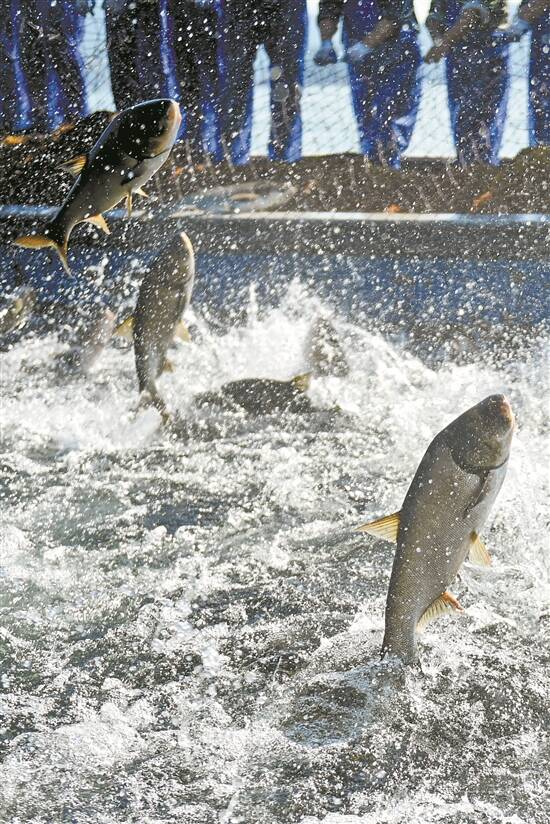 10月22日,捕捞队员在千岛湖黄山尖水域使用巨网合力捕鱼 |