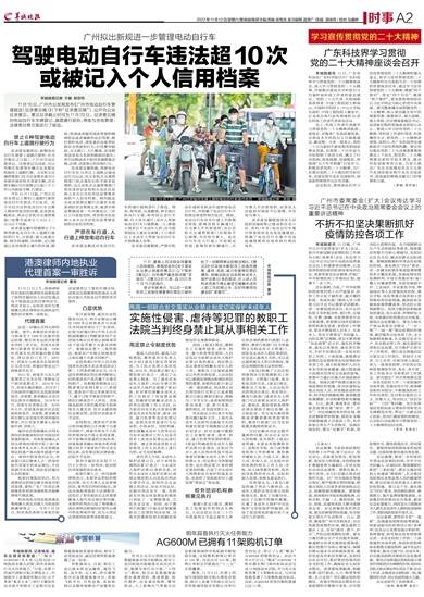 羊城晚报记者 王楠 郭思琦 11月10日,广州市公安局发布《广州市电动自行车管理规定(征求意见稿)》(下称“征求意见稿”),公开向公众征求意见。意见征求截止时间为11月29日。征求意见稿对电动自行车车辆登记、道路通行规则、停放与充电管理、法律责任等方面进行了规定。 禁止6种驾驶电动自行车上道路行驶行为 征求意见稿指出,新购电动自行车需要上道路行驶的,应当自购车之日起三十日内完成注册登记。注册登记完成前,可以凭购车发票等车辆合法来源证明临时上道路行驶。公安机关交通管理部门应当在受理申请当日审核申请材料并查验车辆,对合规车辆应当自受理之日起三个工作日内核发号牌、行驶证。 今年10月1日起,广州正式对未登记上牌仍上道路行驶的电动自行车依法予以处罚。对于市民关注的电动自行车无牌上路如何处罚的问题,征求意见稿规定,将由公安机关交通管理部门处警告或者五十元以上二百元以下罚款。 征求意见稿中明确禁止了6种驾驶电动自行车上道路行驶时的行为,分别是:驶入高速公路、城市快速路、内环路、过江隧道以及其他禁止通行的区域、路段;饮酒或者服用国家管制的精神药品或者麻醉药品后驾驶;拨打接听电话、浏览通讯设备等妨碍安全驾驶的行为;行经繁华路段、交叉路口、人行横道、急弯路等容易发生危险的路段时超车;牵引动物或者不使用容器搭载动物;法律、法规禁止的其他行为。 征求意见稿明确,驾驶电动自行车有10次以上道路交通违法行为记录,经公安机关交通管理部门依法通知后拒不接受处理的,由公安机关交通管理部门将其身份信息和相关违法信息纳入本市公共信用信息管理系统的个人信用档案。网约配送企业未按规定履行交通安全或者消防安全管理义务,被责令停业整顿或者一年内被处以三次以上行政处罚的,将其相关信息纳入本市公共信用信息管理系统的企业信用档案。 严禁在车行道、人行道上停放电动自行车 征求意见稿还对电动自行车的通行规则进行了规范。例如,转弯前,注意瞭望,伸手或打转向灯示意;转弯时让直行车辆、行人优先通行;成年人驾驶电动自行车只能搭载一人;搭载六周岁以下未成年人的,应当使用固定儿童安全座椅;十六周岁以上未成年人驾驶电动自行车不得搭载人员等。 征求意见稿提到,严禁在机动车道和非机动车道停放电动自行车,并明确了电动自行车不按规定停放的相关处罚。例如,电动自行车在车行道上不按规定停放,影响其他车辆通行,且当事人不在现场的,由公安机关交通管理部门对现场予以清理,并告知当事人。电动自行车在人行道上不按规定停放,影响其他车辆通行,且当事人不在现场的,由各区人民政府对现场予以清理,并告知当事人。 征求意见稿鼓励各区人民政府加强统筹已建成的住宅小区、各村(社区)电动自行车集中停放场所及充电设施建设,明确了电动自行车集中充电设施按照所在场所执行相应电价。