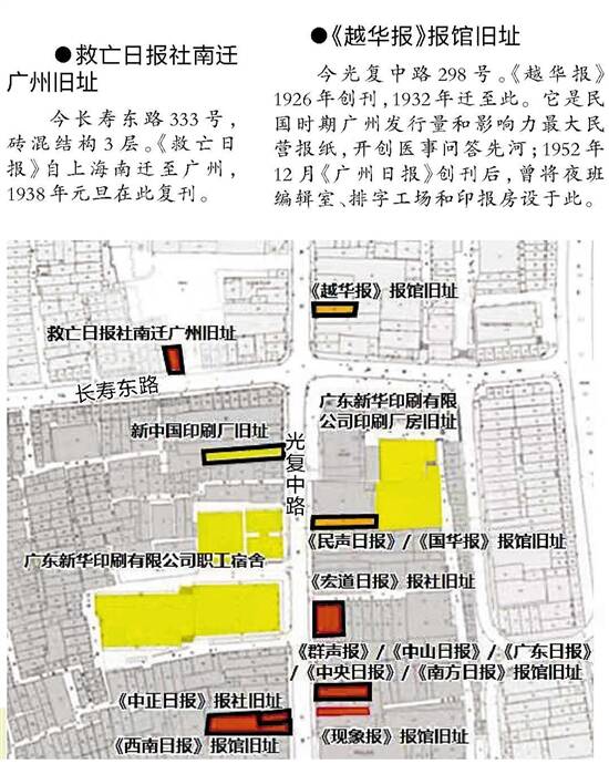 文/羊城晚报记者 吴小攀 甘卓然 文艺 实习生 梁善茵 刘天曲 图/受访者提供(除署名外) 上个世纪三十年代,位于广州西关的光复中路曾是中国最先进报业集中地,被称为“报馆街”。据悉,以此为中心的相关街区保护活化实施方案已提交有关部门审批,修复工程即将展开。蒙着厚厚历史烟尘的报馆街是如何形成的?现状如何?将以什么样的面貌“重生”?日前,记者走访现场,采访了相关人士—— 现状 老区旧街,走过一众风云人物 光复中路属于广州荔湾区,这条南北走向的街道,承载着中国近现代报业荣光,承接近两百年前邻近十三行商馆区及后来沙面租界区的办报传统。在1938年前后已是报馆、印刷厂、发行所林立,各式运报车在这片街区如潮水般聚散。如今,这里往来的大多是与报业无关的普通商贩,空气中已不复当年纸墨香…… 乍看之下,这是一条有点破旧的老区旧街,南向行驶的单行道经常因车辆违停而有点堵塞,只有柏油路面和人行道上的地砖是新铺的。两边大多是两三层高的旧楼房,沿街一楼是五金店、维修店、粥粉面店等,招牌五颜六色,电线杆横七竖八。 沿着人行道行走,时不时会看到一些人家门口墙上嵌着黑底金字说明牌——“广州市传统风貌建筑”或“广州历史建筑”:《西南日报》报馆旧址、《中正日报》旧址、《民声日报》报社旧址、新中国印刷厂旧址……有的旧址是简陋的西关民房,甚至还保留着木趟栊门;有的是中西合璧的旧水泥建筑,立柱门面、圆拱屋顶、满洲窗,虽然墙体斑驳脱落,仍不同凡响。 《群声报》旧址马路正对面居民房的一位住客告诉记者,这栋水刷石、西式柱式的四层建筑常年大门紧闭,应该早就没有人住。走进《西南日报》旧址所在楼房,沿着锈迹斑斑的陡峭镂空铁梯上行到二楼,楼道光线昏暗,两边格仔房房门紧锁。《中正日报》旧址内更是纸屑、烟头遍地,墙上落满灰尘,蛛网密布。 长寿路呈东西走向,与南北向的光复中路呈正十字交叉,红色《救亡日报》旧址就在交叉路口的长寿东路上。今年3月8日,广东省政协副主席许瑞生带领省政协专题调研组成员,到此进行历史文化传承保护专题调研,并在其后召开的座谈会上提出,要充分挖掘名人故居线索,特别是历史重大事件发生地背后的故事,深入揭示名人故居的文化价值。 《救亡日报》旧址是一栋三层楼的灰色水泥建筑。据许瑞生《广州昌兴街出版往事寻踪》一文所述,当年楼下是发行部,二楼是编辑部,三楼一部分堆存报纸,一部分作同人宿舍。如今,一楼是珠宝店,二楼、三楼有人居住,已换上新铝合金窗,窗帘低垂。很难想象,看起来如此不起眼的老街,曾经走过郭沫若、夏衍、欧阳山、草明、司马文森、黄新波、钟敬文等风云人物。“报馆街”,承载着一个逝去的时代…… 记忆 几度兴衰,报馆印厂聚而复散 鸦片战争前夕,西方人在广州十三行地区创办多种报刊,这里便成为中国近代报刊的诞生地。其后,办报中心在这片区域内不断迁移,直至上个世纪二三十年代迁移到如今的光复中路一带,因为离沙面租界不远,物流方便,因此,许多报馆的编辑、印刷、发行及相关人员的吃住行逐渐集中于此。以光复中路为中心的繁忙报业街区渐渐形成,俗称“报馆街”。 据《荔湾区志》记载,民国时期西关报社有130多家,占当时广州全部报纸的半数以上。而据最新调查,自清代以来仅报馆街区域就存在过63家报馆、12家印刷厂,出版的报纸大致包括商贸信息、革命思潮、生活大众三大类。其中,《七十二行商报》上刊登很多商贸广告;《越华报》面向生活大众,是较早做卫生宣传和女性形象宣传的报纸之一;还有一些报纸倡导革命思潮,如《救亡日报》就以抗日宣传为己任。 八十四年前,郭沫若曾踏足这条街,寻找复办《救亡日报》的合适社址。《救亡日报》是由国共合办的报纸,创刊于上海,社长是郭沫若,总编辑是夏衍。据夏衍在《懒寻旧梦录》中回忆,上海沦陷后,周恩来指示把《救亡日报》搬到广州出版;郭沫若经过香港先行到达广州,通过关系在长寿路找到社址。据郭沫若在《洪波曲》中回忆,广东最高军事长官余汉谋表示“每月愿捐助毫洋一千元,按月支付”,《救亡日报》得以在1938年元旦复刊。 为方便工作,《救亡日报》吸收了一些广东籍人士参加工作。欧阳山、草明、司马文森、黄新波当义务记者,钟敬文等当义务撰稿人。工作人员既无薪水,也无稿费,每人每月只发三五元的零用费;报社为外地人提供宿舍,大家一起吃大锅饭。 抗战期间,自1938年5月后,日军开始轰炸广州市区,造成大量市民伤亡。夏衍回忆:“我当时正在官禄路宿舍写稿,附近落下一颗炸弹……我们全社动员,去采访轰炸后的惨状。当时遍地都是被烧焦了的尸体,这是我毕生看到的最惨的情景。” 10月21日,日军进占广州。在此前两天,夏衍已有预感,在托人带给香港的廖承志的信中说,“当局好像早已决心放弃这个中国仅有的富庶的城市了”“整个广州像被抛弃了的婴孩似的”。广州沦陷前一天,《国华报》《越华报》《环球报》都宣布自动停刊,夏衍“在广州市街最后的散步”后,回到报馆,写下停刊社论《忍着眼泪和广州的市民暂别》…… 1945年抗战胜利以后,报馆街的部分报馆复刊,但有些已开始向东迁移。直到上个世纪八十年代,街区内报馆全部迁出。如今,只有少数街坊知道,民国时期,这里曾经存在过一