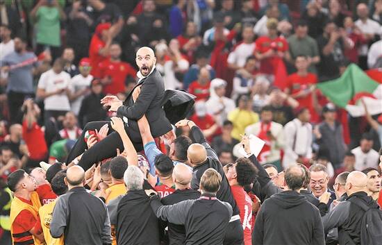 摩洛哥队成员在比赛后抛起主教练瓦利德·雷格拉吉庆祝 新华社发 |