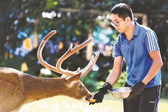 第三代广州动物园人林庆儒正在喂海南坡鹿 |