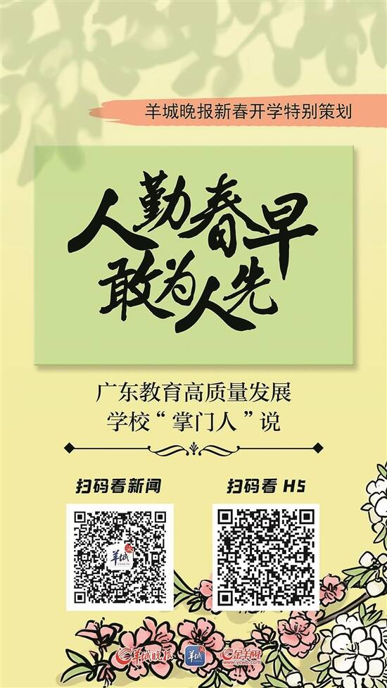 文/羊城晚报记者 陈晓璇 陈亮 崔文灿 蒋隽 何宁 海报/杜卉 2月4日是立春日。羊城晚报社特别推出《人勤春早 敢为人先——广东教育高质量发展学校“掌门人”说》海报特刊,邀请广东省多个地市基础教育、高等教育、职业教育的学校负责人,一起说方法、比干劲、谈目标。共有100多所学校“掌门人”从不同方面阐述对教育高质量发展的见解,展示办好人民满意的教育的决心和蓝图。 特刊寄语:借“春天的力量”奋楫笃行 高质量发展的蓝图中,教育是民生的基石。广东省教育厅党组成员、副厅长李璧亮为该特刊作序并表示,广东省委、省政府召开的“新春第一会”发出了全省高质量发展的动员令,也向广东教育实现高质量发展吹响了冲锋号。 “乘着这股东风,我们将以更大力度继续推进基础教育高质量发展,坚定不移贯彻落实总书记、党中央决策部署,以实际行动贯彻落实党的二十大精神,扎实推进‘百县千镇万村高质量发展工程’,推进教育优质均衡发展,满足人民群众对美好生活的新期待。”李璧亮呼吁全省教育工作者:站在新征程的起点上,让我们担起新使命,借助“春天的力量”奋楫笃行,努力交出人民满意的答卷。 中国教育学会副会长吴颖民在寄语中表示,广东经济社会的高质量发展,离不开科技、教育和人才的有力支撑。教育要实现高质量发展,必须全面落实立德树人根本任务,必须在培养目标上着力推动由应试能力导向向全面素养导向转变;在培养方式上着力推动由高消耗、低收益的粗放经验型向创新型、数字化转变,在用好教育评价指挥棒上下功夫。 基础教育:坚定不移深化素质教育 “通过羊城晚报新春开学海报特刊,我们感受到了广东教育人满满的责任感。” 4日晚上,海报特刊在羊城晚报客户端羊城派推送,引起了极大的关注,不少家长表示对广东教育充满期待。 广东实验中学党委书记、校长全汉炎在寄语中表示:“我们将继续深耕内涵,厚积薄发,五育并举,以高度的责任感,办有温度的教育,育有理想的人才,实践探索拔尖创新人才培养模式,积极发挥辐射引领作用,为全省基础教育均衡发展、高质量发展贡献省实的智慧和力量。” 广州市执信中学党委书记何勇谈到,要遵循教育规律和人才成长规律,坚定不移深化素质教育,优化课程建设,推进基于核心素养的教学改革,推动育人方式的变革,为学生终身持续发展奠定坚实的知识基础、关键能力和优秀品格,持续提升教育质量,为基础教育高质量发展做出更大贡献。 高等教育:培养人才服务国家战略需求 高等教育又将如何实现高质量发展?广东高校的“掌门人”纷纷表示,广东高校将聚焦立德树人,以教育、科技、人才“三位一体”,做好人才培养、科技创新的本职工作。高校将结合自身特色优势,服务广东现代化建设,为广东高质量发展贡献高等教育力量。 “中大将把握广东建设‘双区’和横琴、前海、南沙三大平台的发展机遇,将高等教育高质量发展与广东经济社会发展紧密结合。”中山大学党委书记陈春声表示,今年中大将以更加昂扬的姿态、饱满的精神、实干的行动,加快中国特色世界一流大学建设,为“扎实推进广东高质量发展”“再造一个新广东”贡献中大力量。 各高校还表示,将紧抓高质量发展机遇,围绕大学的主要职能,培育高水平师资队伍、深化科教融合育人,深度融合自身学科特色优势,不断培养供给高素质复合型人才,服务国家战略需求。 职业教育:为“制造业当家”贡献力量 作为一种类型教育,职业教育与经济社会发展紧密相连,由“制造业起家”的广东正吹响“制造业当家”高质量奋进的号角。 从广东职业院校和技工院校“掌门人”发来的一句句寄语中,有读者表示,感受到职业教育追赶时代的自信与担当。深圳职业技术学院党委书记杨欣斌表示,将奋力建设国际领先的高技术技能人才培养高地、中国特色的产教融合创新高地、蜚声国际的名匠大师汇聚高地、湾区卓越的应用技术研发高地、辐射全国的社会服务高地、引领全球的职教创新高地,为广东依靠“制造业当家”挺起现代化建设的产业“脊梁”贡献职业教育力量。