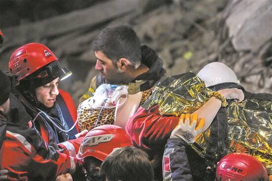 当地时间2月14日,安塔基亚市,强震后的第九天,救援人员在废墟中搜救出一名女性 |