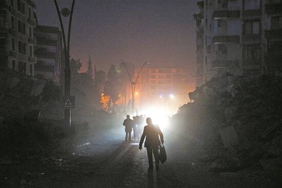当地时间2月14日,安塔基亚市。深夜时分,一群幸存者在废墟中向着救援队伍的灯光前行 |