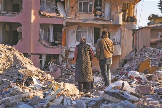 当地时间2月14日,安塔基亚市,一对母子在废墟上凝视自己曾经的“家” |